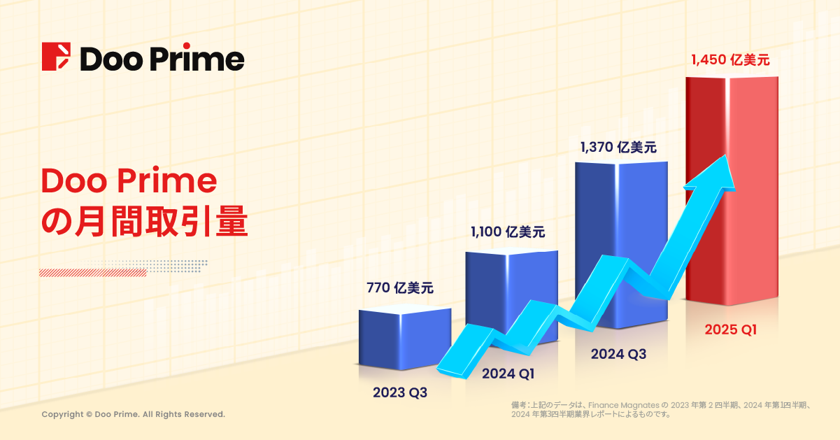 さらに、Doo Primeの月平均取引高は2025年第1四半期に1450億ドルに達し、2024年第3四半期の1370億ドルから約5.8%の成長を見せました。これらのデータは、世界的に資本流動が活発になる中で、Doo Primeが優れたグローバル取引サービスを提供し、世界中のトレーダーからの信頼を得ていることを示しています。この結果、 Doo Prime というブランドの国際的な影響力が急速に拡大しています。