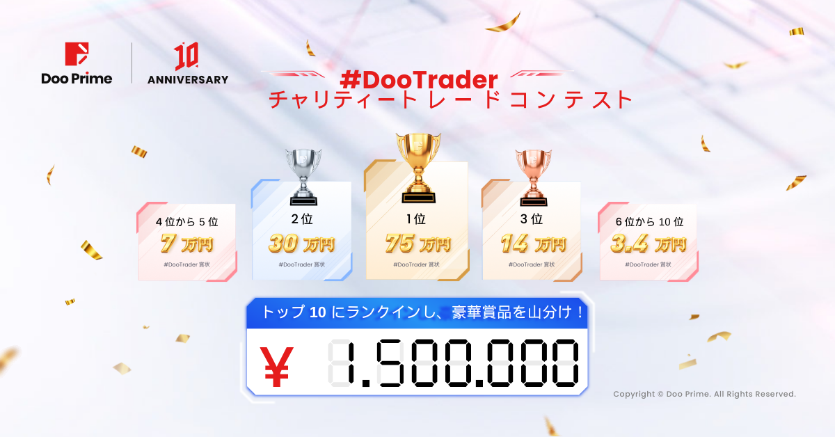 最低入金の条件なしで簡単に参加可能です。 豪華な賞金や限定賞品をチェックしましょう!以下の手順を参考に、日本初のDoo Prime 10周年記念 #DooTrader チャリティートレードコンテストのトップ10入りを目指しましょう。 #DooTrader チャリティートレードコンテストはDooPrimeに登録し、口座を開設するだけでエントリーが可能です。この機会を逃さず、勝利をつかみましょう!