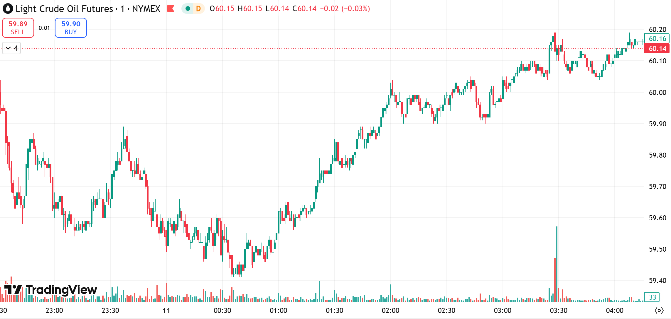 Oil remains in a medium-term sideways range, oscillating near the mid-zone. The MACD indicator shows mixed momentum, suggesting continued consolidation. Analysts expect intraday movement to remain range-bound between $59.0–$62.5.