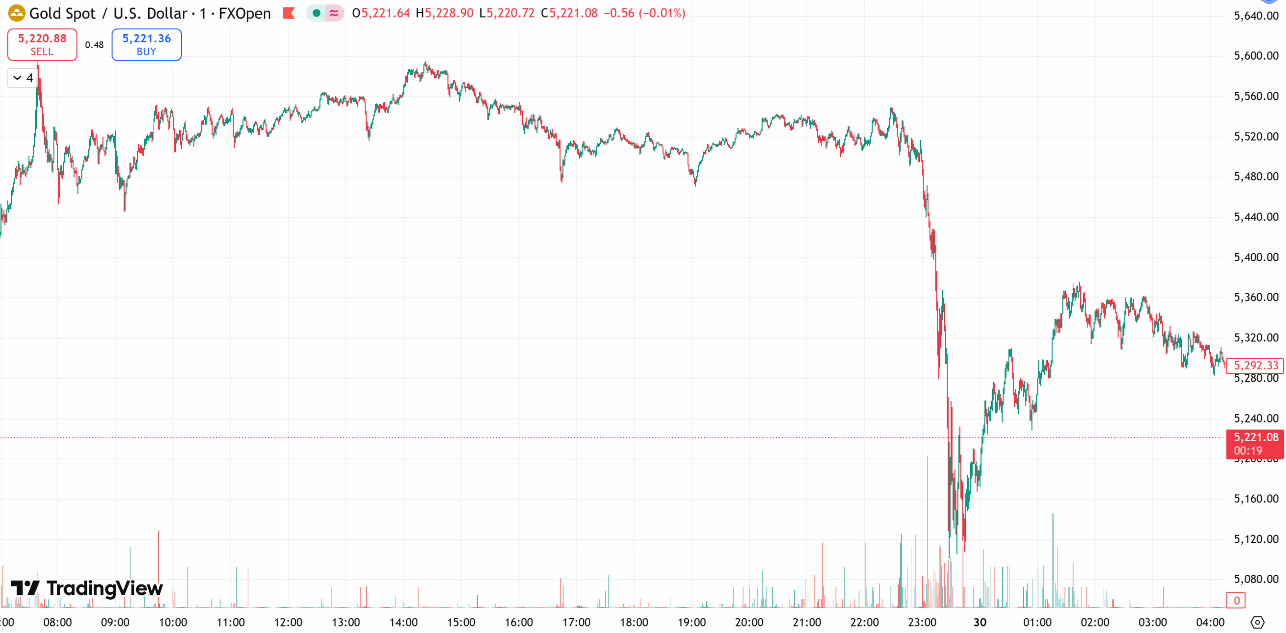金价周四下跌,因投资者在价格创下历史新高后选择获利了结,但受经济和地缘政治不确定性支撑,金价仍有望录得自上世纪 80 年代以来的最佳月度表现。现货金下跌 1.3%,报每盎司5330.20 美元,盘中一度触及 5596.33 美元的纪录高点后逆转,最低下探至 5104.98美元。