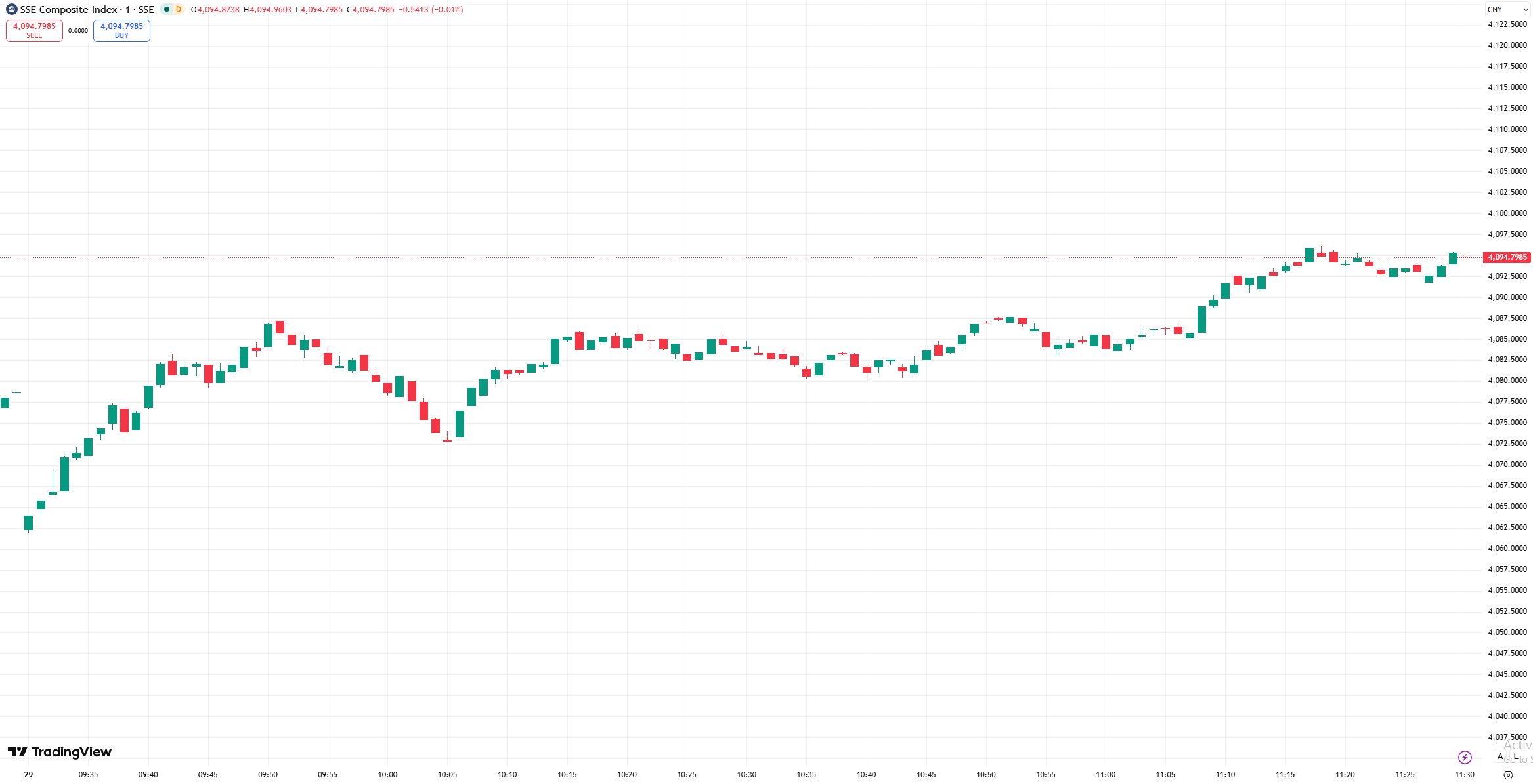 A 股三大指数早盘集体上涨,截至午盘,上证指数涨 0.4%,深证成指涨 1.58%,创业板指涨 2.27%,北证 50 涨 0.95%。全市场成交额 16330 亿元,较上日成交额缩量 371 亿元,全市场超 4000 只个股上涨。