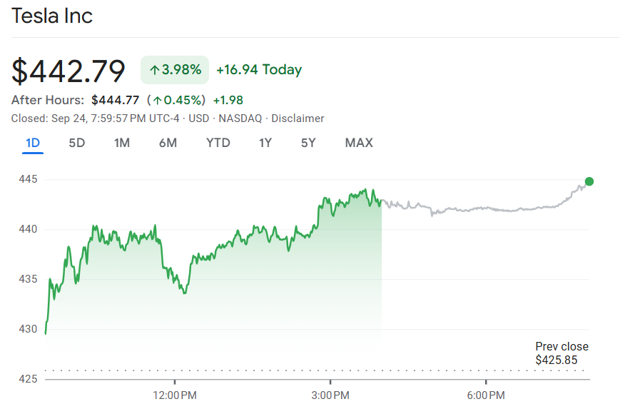 9 月 24 日至 25 日, 特斯拉(TSLA)股价周二逆市上涨 4%,因市场普遍预计第三季度交付量将显著上升。受美国 电动车税收抵免将在 9 月底到期的刺激,分析师认为消费者购车需求被大幅提前。
