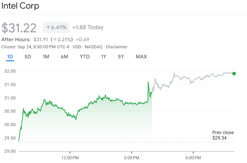 英特尔据传与苹果洽谈入股,股价大涨逾 6%