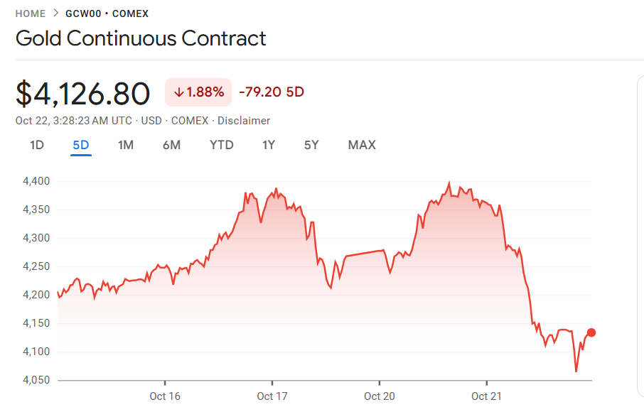 据《彭博社》最新报价,现货黄金报每盎司约 4120 美元,盘中一度重挫 6.3%;白银则延续前日跌势。此前金价连续数周大涨并多次刷新纪录,主要受市场押注美联储(FED)年内大幅降息及投资者避险需求升温所推动,财政赤字与货币贬值担忧亦助长了黄金的避险吸引力。