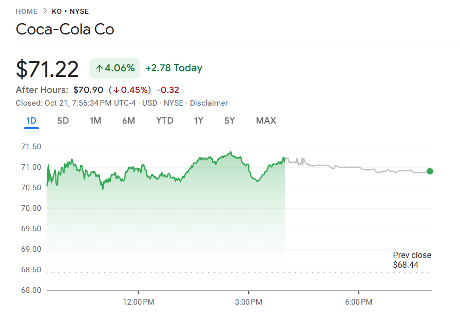 可口可乐(KO)公布第三季度财报,营收同比增长 5% 至 125 亿美元,超出市场预期的 124 亿美元;调整后每股收益(EPS)为 0.82 美元,高于预期的 0.78 美元。