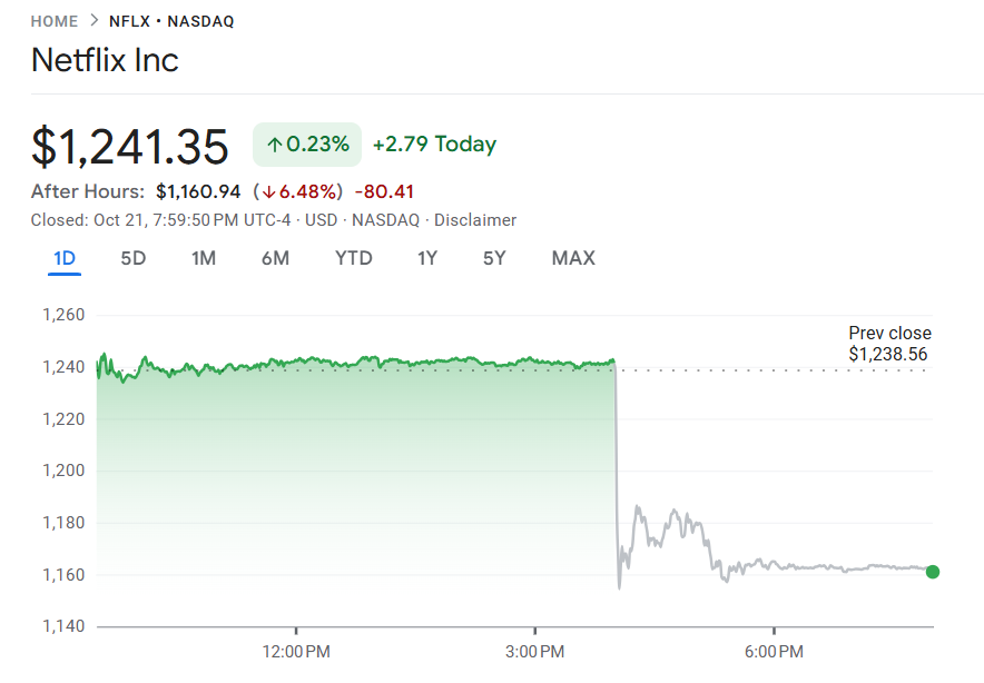 10 月 21 日至 22 日,奈飞(NFLX)公布第三季度财报,营收同比增长逾 17%,符合分析师预期,但每股收益(EPS)低于市场预期,净利润亦少于预估约 14%。财报公布后,奈飞股价在盘后交易中下跌 6%,报约 1166.90 美元。