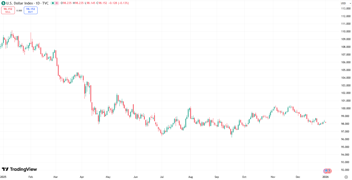 2025 年美元指数全年下跌约 8%,创下自 2017 年以来最大年度跌幅。市场普遍认为,若总统特朗普任命的新任美联储 (Fed) 主席倾向鸽派政策立场,美元可能在新一年继续承压走低。