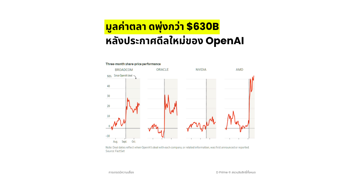 หลังจาก OpenAI ประกาศความร่วมมือกับ Broadcom, Oracle, Nvidia และ AMD มูลค่ารวมของตลาดหุ้นในกลุ่ม AI เพิ่มขึ้นกว่า 630 พันล้านดอลลาร์สหรัฐ ภายในวันเดียว สะท้อนให้เห็นถึงพลังของเทรนด์ AI ที่ยังคงร้อนแรงทั่วโลก