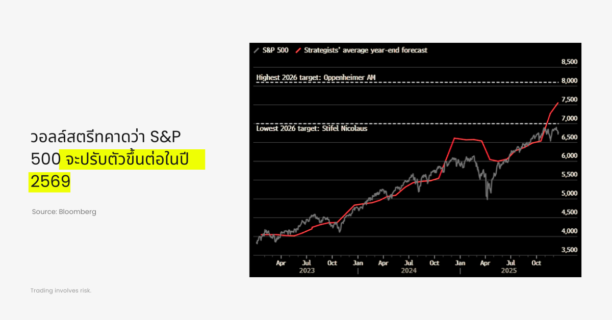 จากข้อมูลของ Bloomberg ธนาคารเพื่อการลงทุนและนักกลยุทธ์รายใหญ่ยังคงคาดว่า ดัชนี S&P 500 จะปรับตัวสูงขึ้นต่อในปี 2569 โดยได้รับแรงหนุนจากสภาพการเงินที่ผ่อนคลาย ความคาดหวังด้านผลประกอบการที่ยังแข็งแกร่ง และสภาพคล่องที่ปรับตัวดีขึ้น