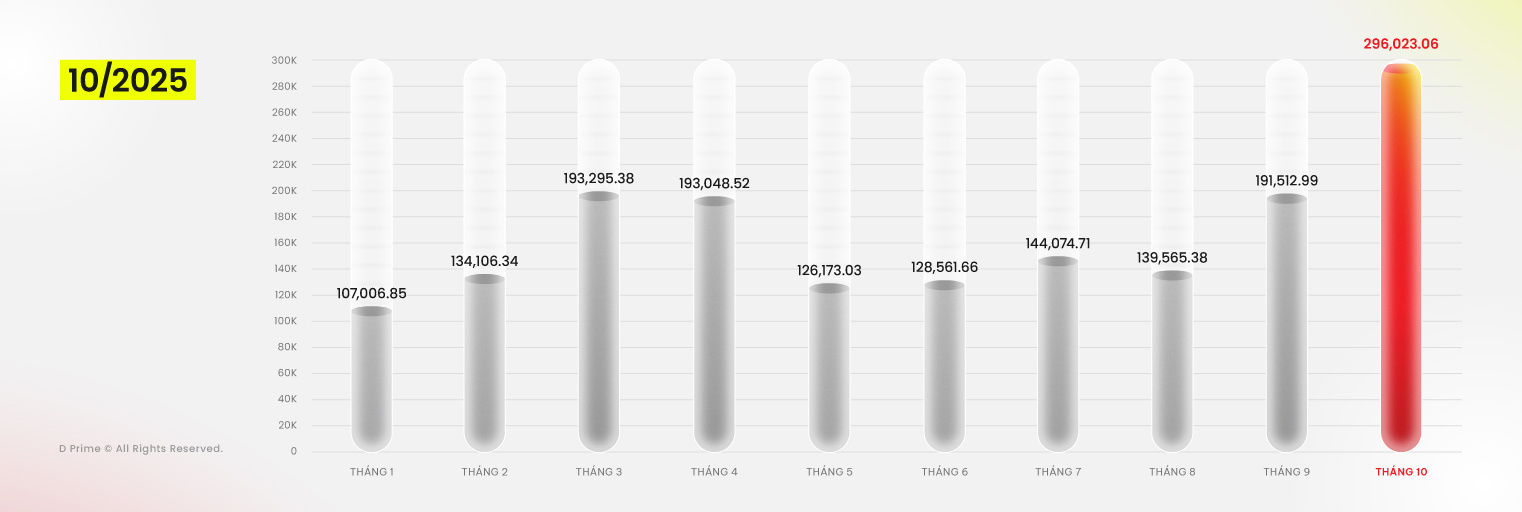 Trong tháng 10/2025, D Prime đã ghi nhận tổng khối lượng giao dịch là 296.05 tỷ USD, tăng 54.75% so với tháng 9. Trong khi đó, khối lượng trung bình hàng ngày (ADV) cũng đã đạt mức 9.55 tỷ USD, tăng 49.58% so với tháng trước.
