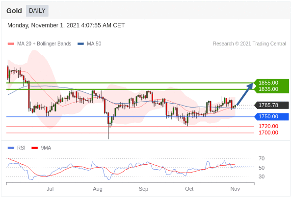 Các vị trí mua trên 1750,00 với mục tiêu là 1835,00 & 1855,00 trong thời gian gia hạn.