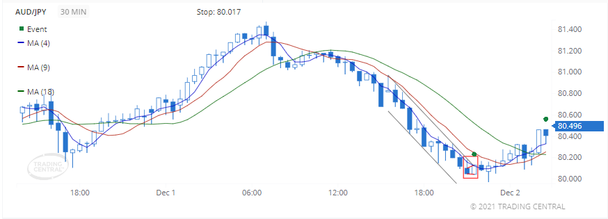 Vào ngày 02 tháng 12 năm 2021 lúc 02:30 GMT, Đường trung bình động 4 thanh vượt lên trên đường MA 9 thanh, đường này vượt lên trên đường MA 18 thanh, báo hiệu một xu hướng tăng mới đã được thiết lập.