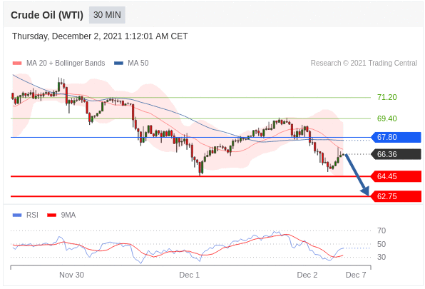 Miễn là vùng kháng cự 67,80 không bị vượt qua, nguy cơ phá vỡ dưới 64,45 vẫn còn cao.