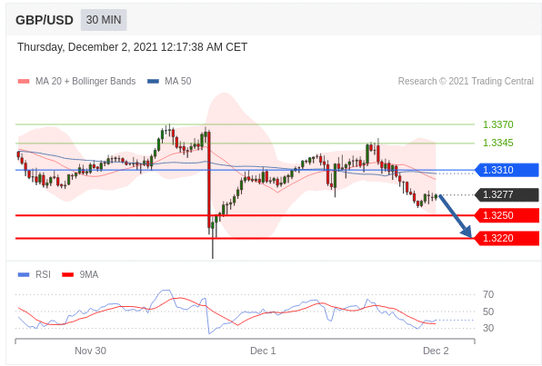 Việc phá vỡ dưới 1,3250 sẽ kích hoạt mức giảm xuống 1,3220.