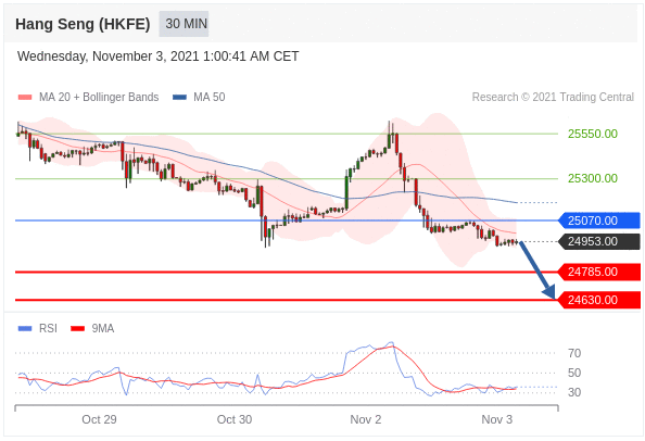 Miễn là 25070,00 là kháng cự, có khả năng giảm xuống 24785,00.