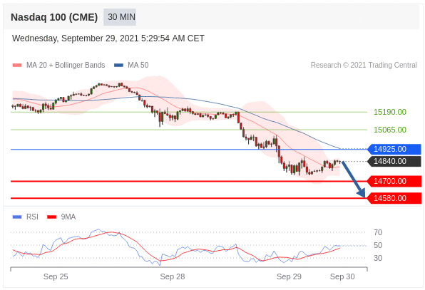 Các vị thế bán dưới 14925,00 với mục tiêu là 14700,00 & 14580,00 trong phần mở rộng.