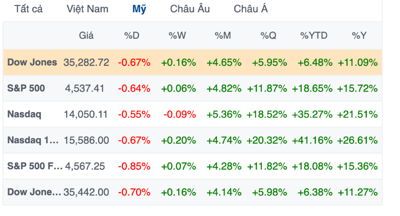 Kết thúc phiên giao dịch ngày thứ Năm, chỉ số Dow Jones rớt 237.40 điểm (tương đương 0.67%) xuống 35,282.72 điểm, chịu sức ép bởi đà giảm của cổ phiếu Honeywell. Lợi suất trái phiếu Chính phủ Mỹ kỳ hạn 10 năm tăng mạnh vượt mức 4% cũng không giúp gì cho tâm lý thị trường. Nếu Dow Jones tăng phiên thứ 14 liên tiếp vào ngày thứ Năm, chỉ số này sẽ ghi nhận chuỗi leo dốc dài kỷ lục kể từ năm 1897.