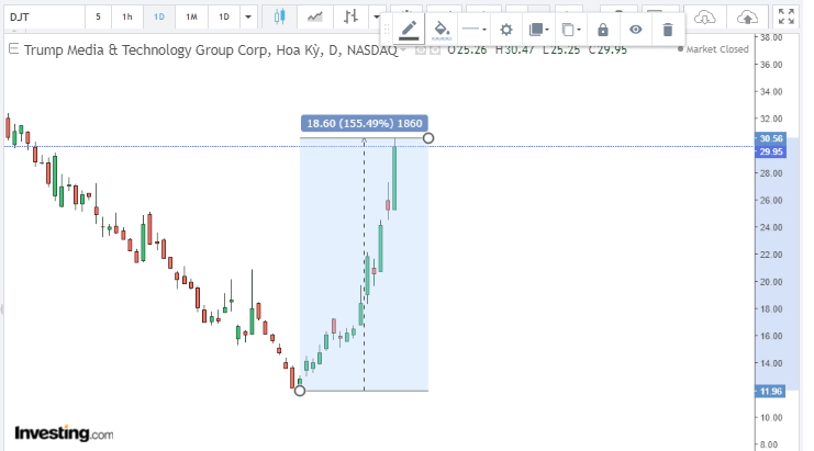 Tuy nhiên, kể từ khi chạm đáy vào ngày 23 tháng 9, cổ phiếu DJT đã tăng gần 150% lên 29,95 USD, giúp công ty có vốn hóa thị trường đạt 6 tỷ USD. Điều này diễn ra trong bối cảnh doanh thu chưa đến 1 triệu USD mỗi quý và công ty đã lỗ hơn 16 triệu USD trong kỳ gần nhất.