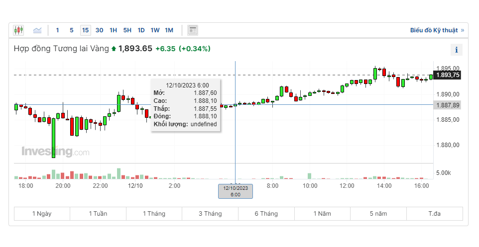Hợp đồng vàng tương lai tích cực nhất của vàng trên sàn Comex của New York, giao tháng 12, tăng 12 USD, tương đương 1%, ở mức 1.887,30 USD/ounce sau mức cao nhất trong phiên là 1.890,85 USD. Điều đó khiến hợp đồng tương lai vàng chuẩn chỉ còn chưa đến 10 USD để quay trở lại mức tăng tâm lý 1.900 USD. Lần cuối cùng vàng Comex được giao dịch ở mức 1.900 USD là vào ngày 27 tháng 9.