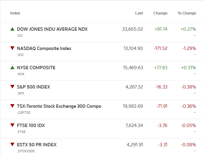 Kết thúc phiên giao dịch ngày thứ Tư, chỉ số S&P 500 lùi 0.38% xuống 4,267.52 điểm, chỉ số Nasdaq Composite mất 1.29% còn 13,104.89 điểm. Trong khi, chỉ số Dow Jones cộng 91.74 điểm (tương đương 0.27%) lên 33,665.02 điểm.