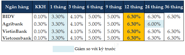 Tương tự, Vietcombank, VietinBank và BIDV cũng giảm lãi suất kỳ hạn ngắn từ 1-3 tháng mức 0.1 điểm phần trăm về còn 3.3%/năm; các kỳ hạn còn lại giữ nguyên. Lãi suất huy động cao nhất tại các ngân hàng này là 6.3%/năm cho các kỳ hạn từ 12 tháng trở lên.