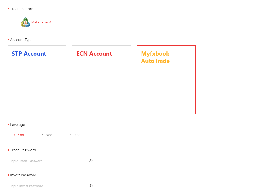 Bước 1: Đăng nhập vào hệ thống của CRM Doo Prime qua website của Doo Prime và tạo tài khoản giao dịch MT4 mới và chọn “Myfxbook AutoTrade” làm loại tài khoản.
