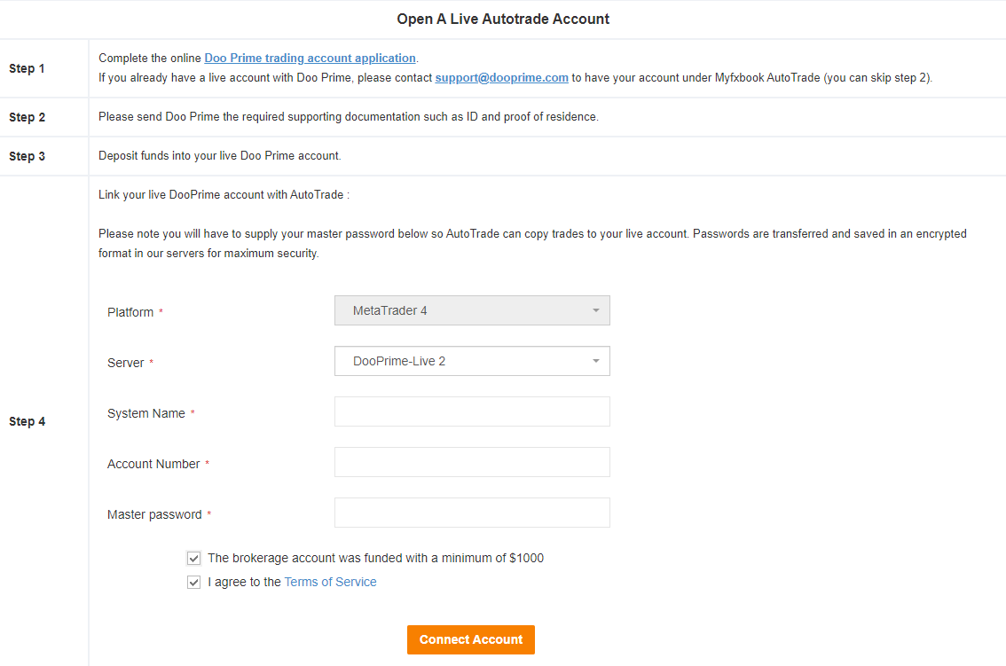Để đăng ký với các nhà giao dịch hoạt động tốt nhất trên Doo Prime Myfxbook AutoTrade, tất cả những gì bạn cần làm là đăng ký một tài khoản giao dịch tiêu chuẩn Doo Prime và liên kết tài khoản với cộng đồng giao dịch qua mạng xã hội Myfxbook AutoTrade