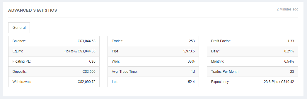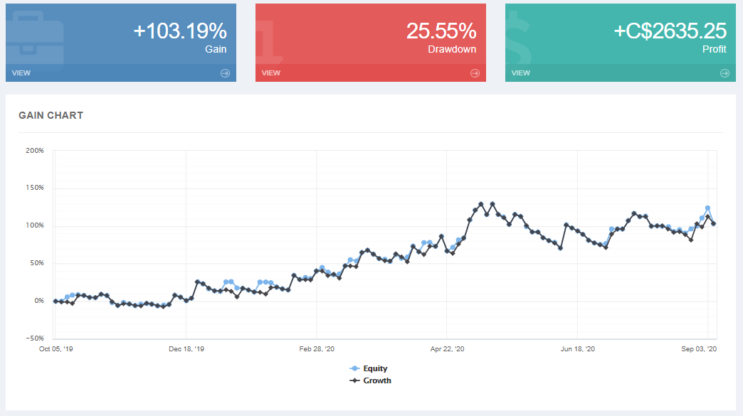 Kể từ khi tham gia vào cộng đồng Myfxbook AutoTrade vào tháng 10 năm 2019, BLUEBERRY đã ghi nhận tổng lợi nhuận là 103,19% tương đương với 2635,25 CAD, với mức rút vốn là 25,55% vào ngày 07/09/2020.