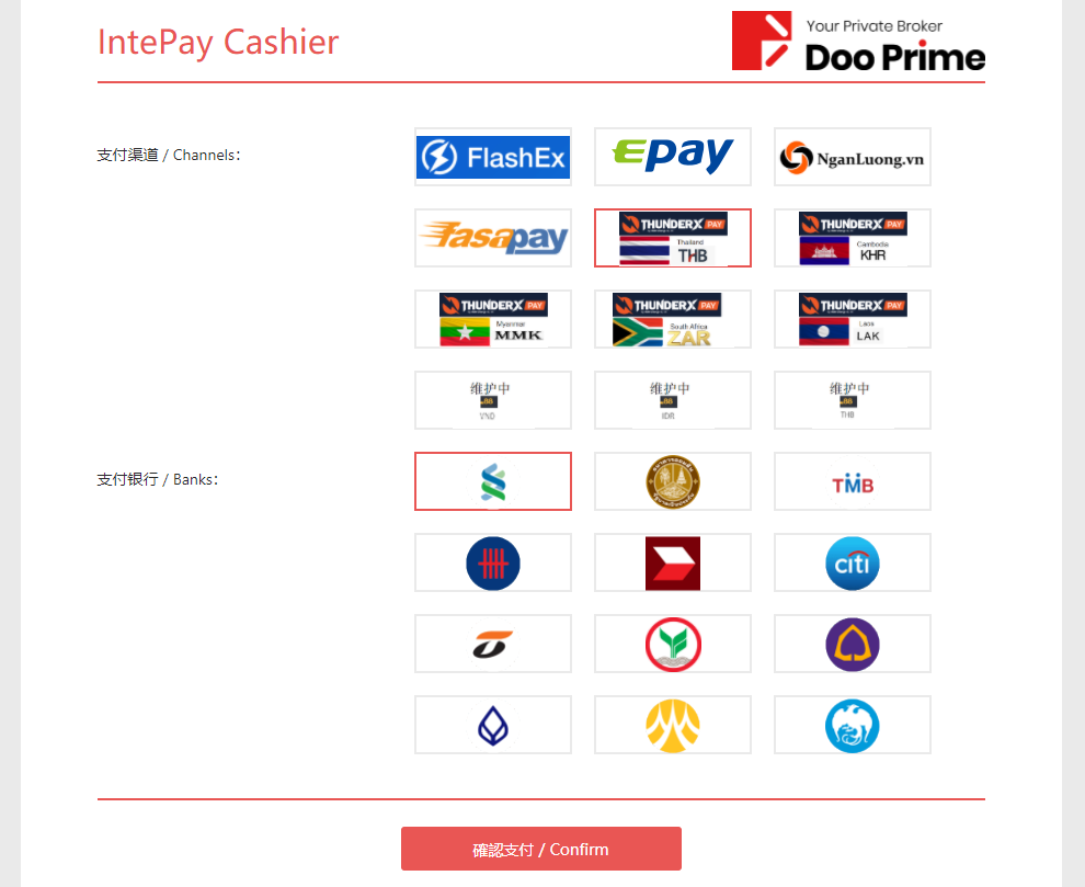 Bước 5 – Chọn ThunderXPay với đơn vị tiền tệ cho khoản tiền nạp của bạn và sau đó chọn ngân hàng để thực hiện thanh toán bằng cách nhấp vào Xác nhận