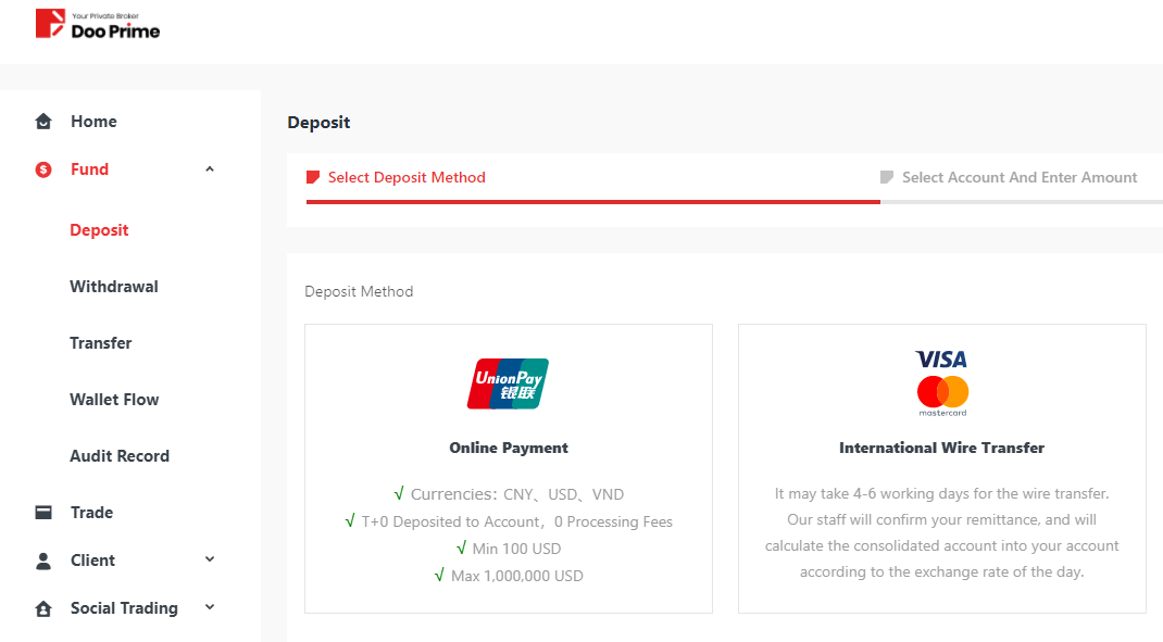 Đối với người dùng nạp tiền qua phương thức thanh toán trực tuyến, họ phải thực hiện thanh toán qua tài khoản đăng ký bằng tên thật của mình. Thanh toán qua tài khoản ngân hàng của người khác không được phép và các kênh thanh toán tiền gửi trực tuyến của Doo Prime không được chấp nhận.