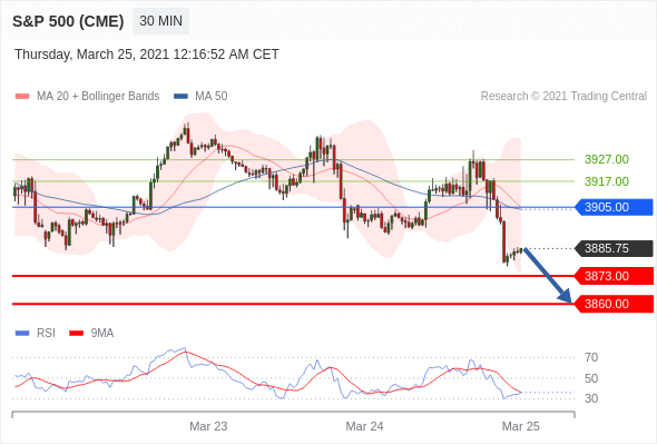 Vào thứ Năm, S&P 500 (CME) có thể giảm xuống 3860,00 – 3873,00, theo phân tích của Trading Central trên Doo Prime.