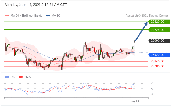 Các vị thế mua trên 28920,00 với mục tiêu là 29225,00 & 29320,00 trong phần mở rộng.