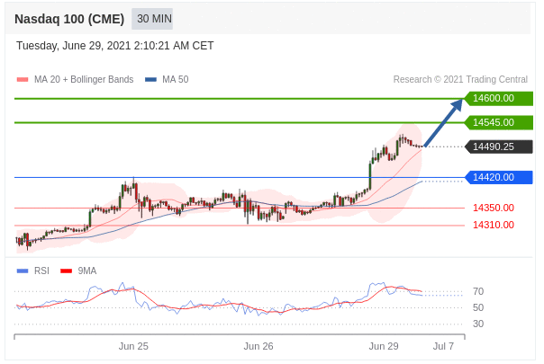 Các vị thế mua trên 14420,00 với mục tiêu là 14545,00 & 14600,00 trong phần mở rộng.