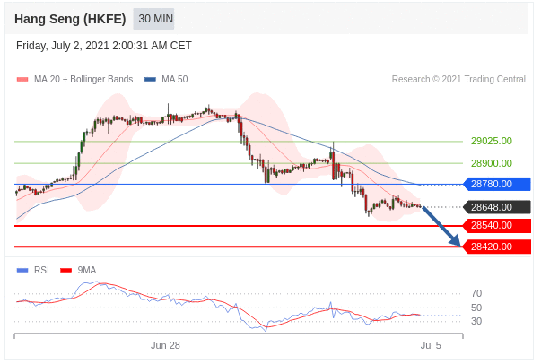Các vị thế bán dưới 28780,00 với mục tiêu là 28540,00 & 28420,00 trong phần mở rộng.
