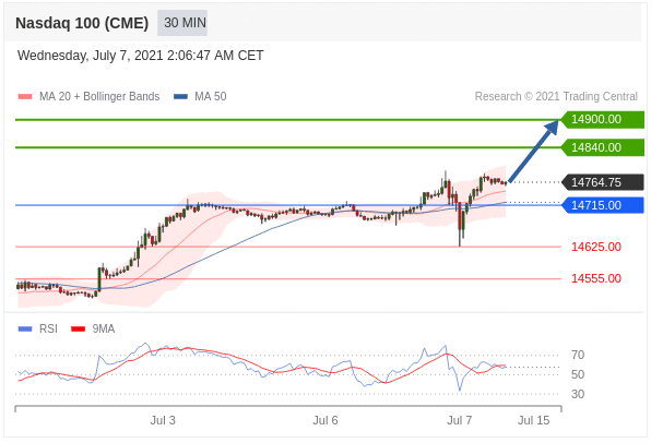 Các vị thế mua trên 14715,00 với mục tiêu là 14840,00 & 14900,00 trong phần mở rộng.