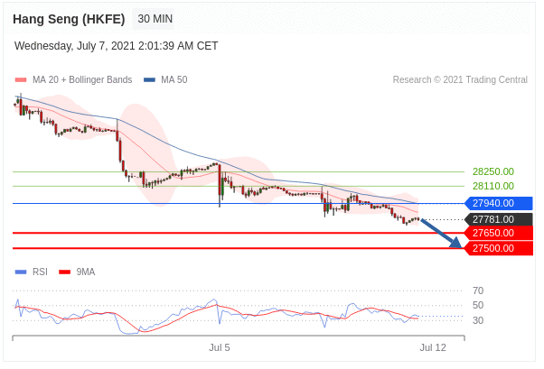 Các vị thế bán dưới 27940,00 với mục tiêu là 27650,00 & 27500,00 trong phần mở rộng.