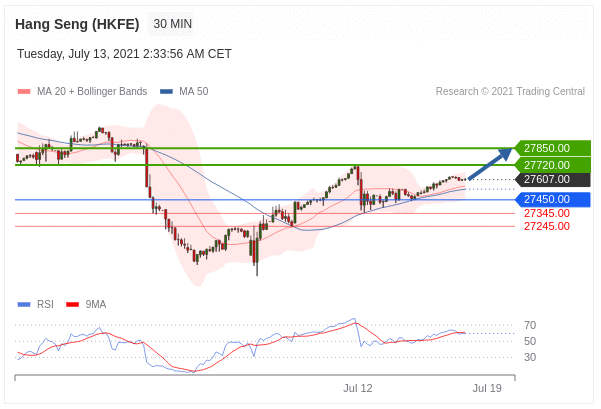 Các vị trí mua trên 27450,00 với mục tiêu là 27720,00 & 27850,00 trong phần mở rộng.