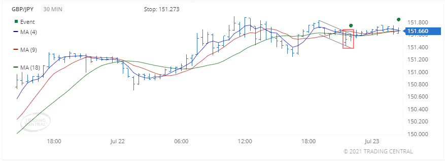 Vào ngày 23 tháng 7 lúc 02:30 GMT, Đường trung bình động 4 thanh vượt lên trên đường MA 9 thanh, vượt lên trên đường MA 18 thanh, báo hiệu một xu hướng tăng mới đã được thiết lập.