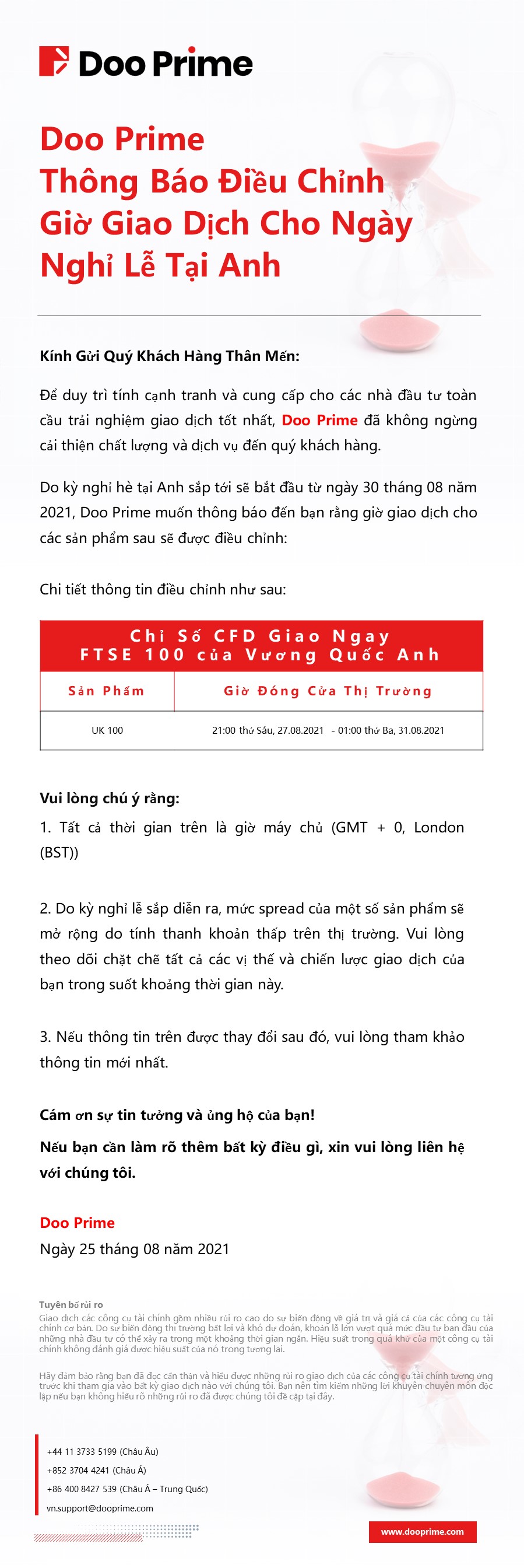 Chúng tôi xin thông tin đến bạn về giờ giao dịch được điều chỉnh cho các ngày lễ sắp tới trong tháng 04 năm 2025.