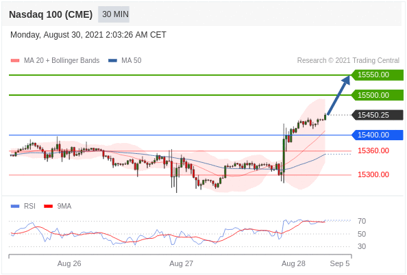 Các vị thế mua trên 15400,00 với mục tiêu là 15500,00 & 15550,00 trong phần mở rộng.