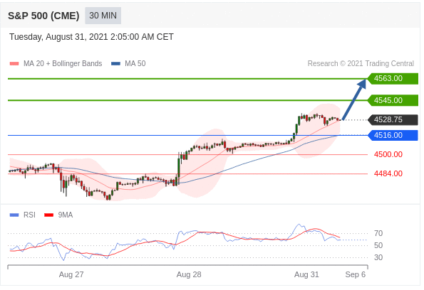 Các vị thế mua trên 4516,00 với mục tiêu là 4545,00 & 4563,00 trong phần mở rộng.