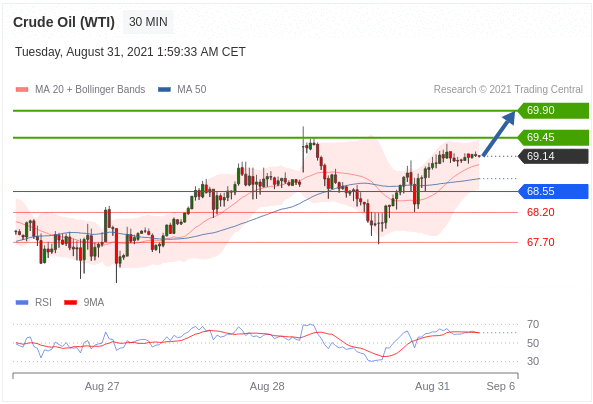Các vị thế mua trên 68,55 với mục tiêu là 69,45 & 69,90 trong phần mở rộng.
