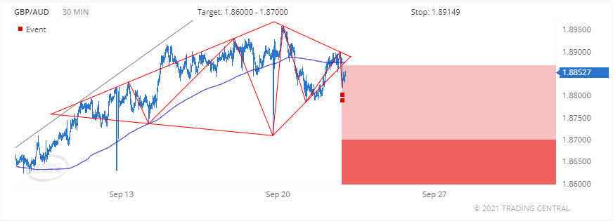 Chúng tôi đã tìm thấy một mô hình có tên là Diamond Top vào ngày 22 tháng 9 lúc 01:30 GMT trên biểu đồ 30 phút, cung cấp mức giá mục tiêu cho tối đa 2 tuần trong phạm vi từ 1,86000 đến 1,87000.