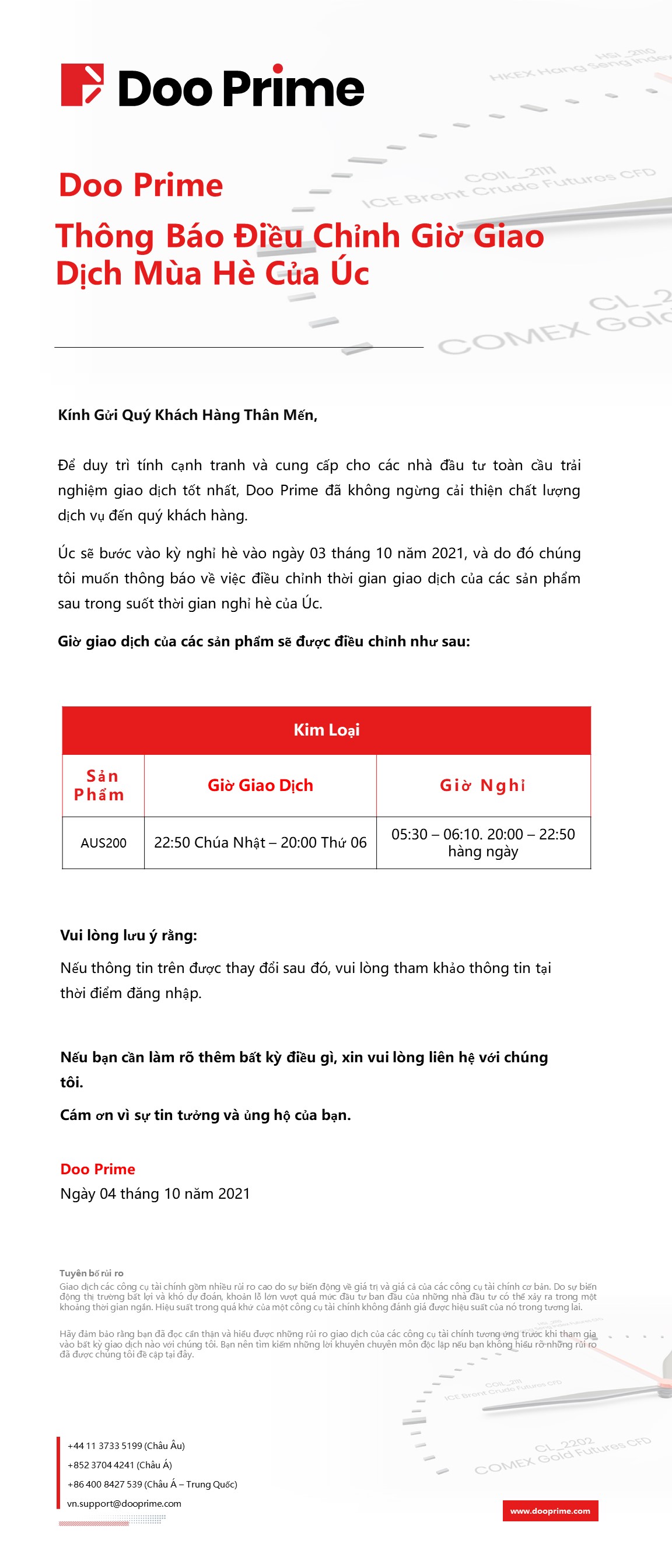 Doo Prime Thông Báo Điều Chỉnh Giờ Giao Dịch Mùa Hè Của Úc